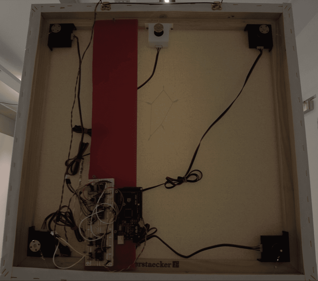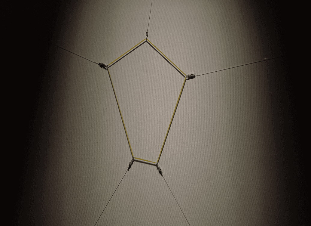 这个装置艺术作品使用了一个 50×50 厘米的画板、若干透明的渔线、步进电机以及其他材料,不断从各个方向拉伸同一条橡皮筋,使其产生不同程度的变形。这种不规则的形变构成了作品的核心。