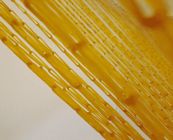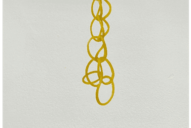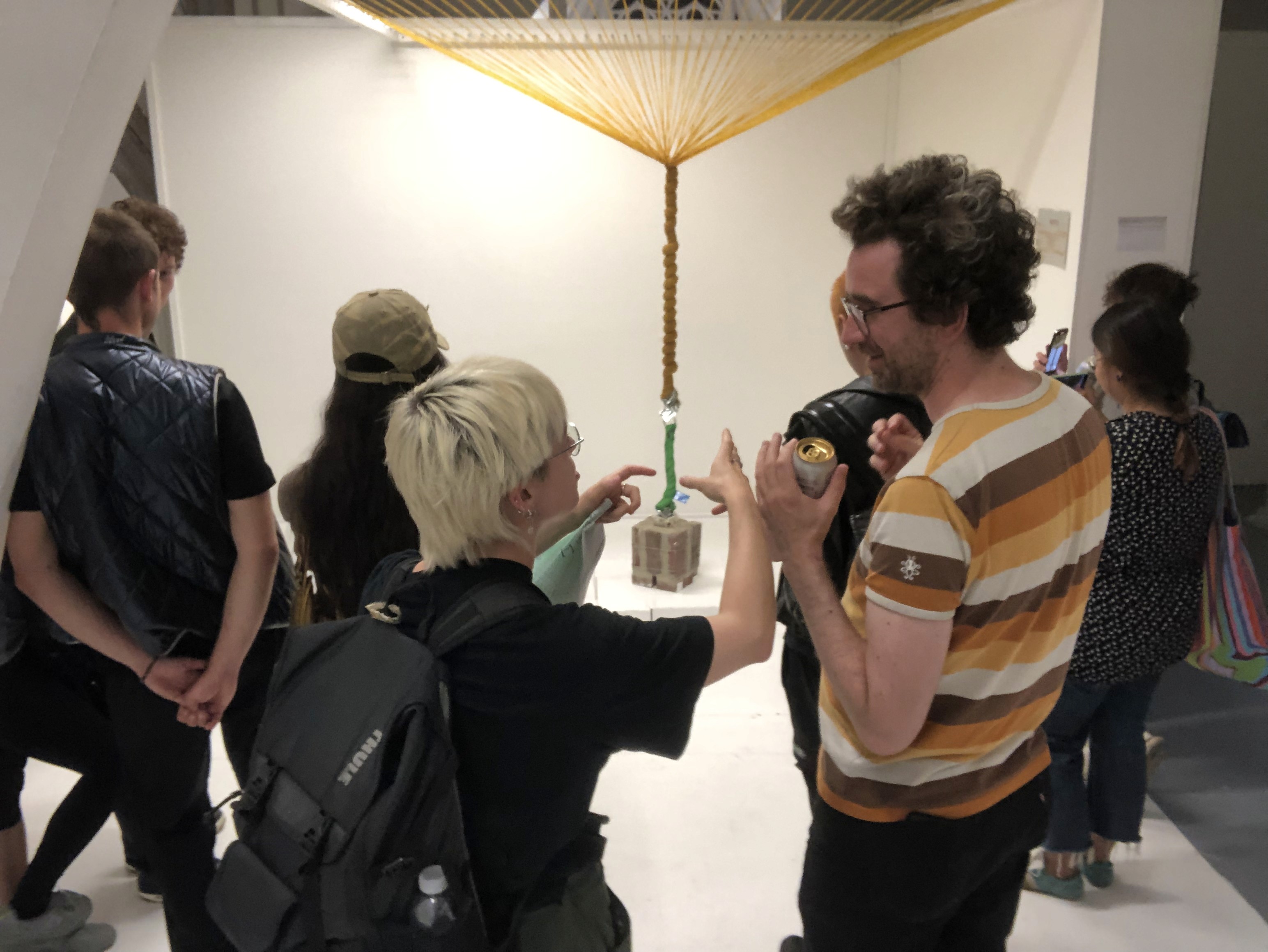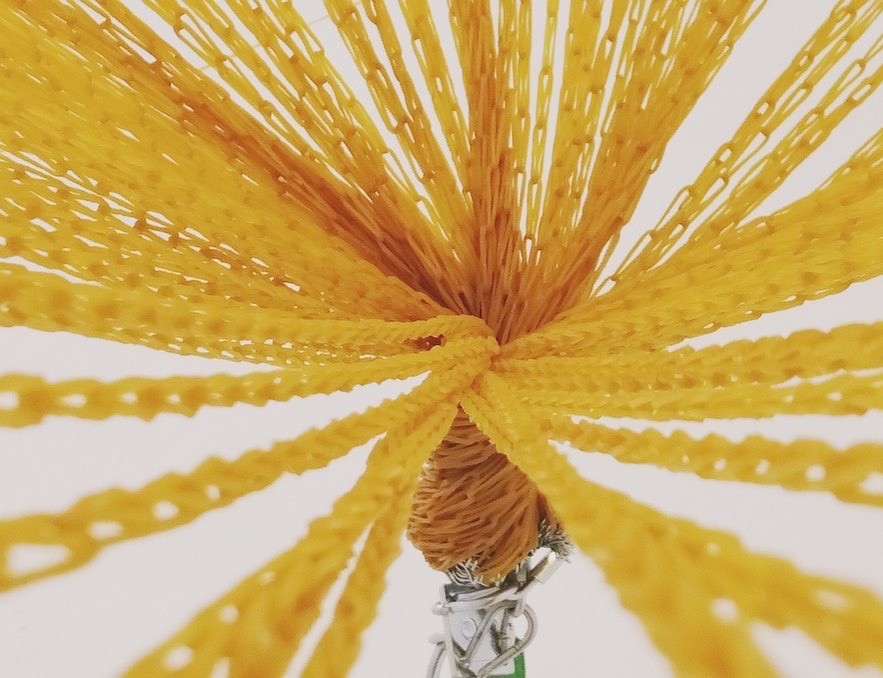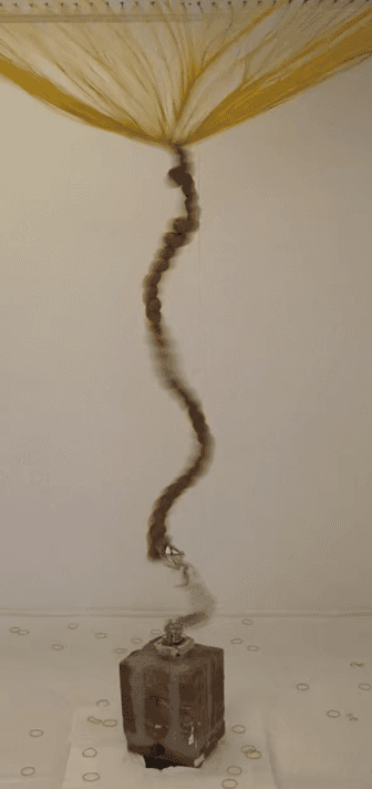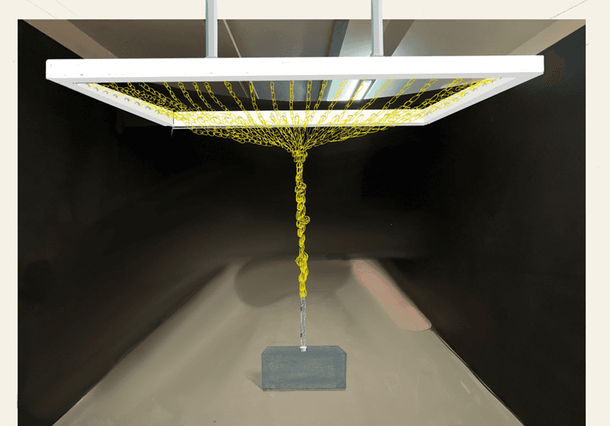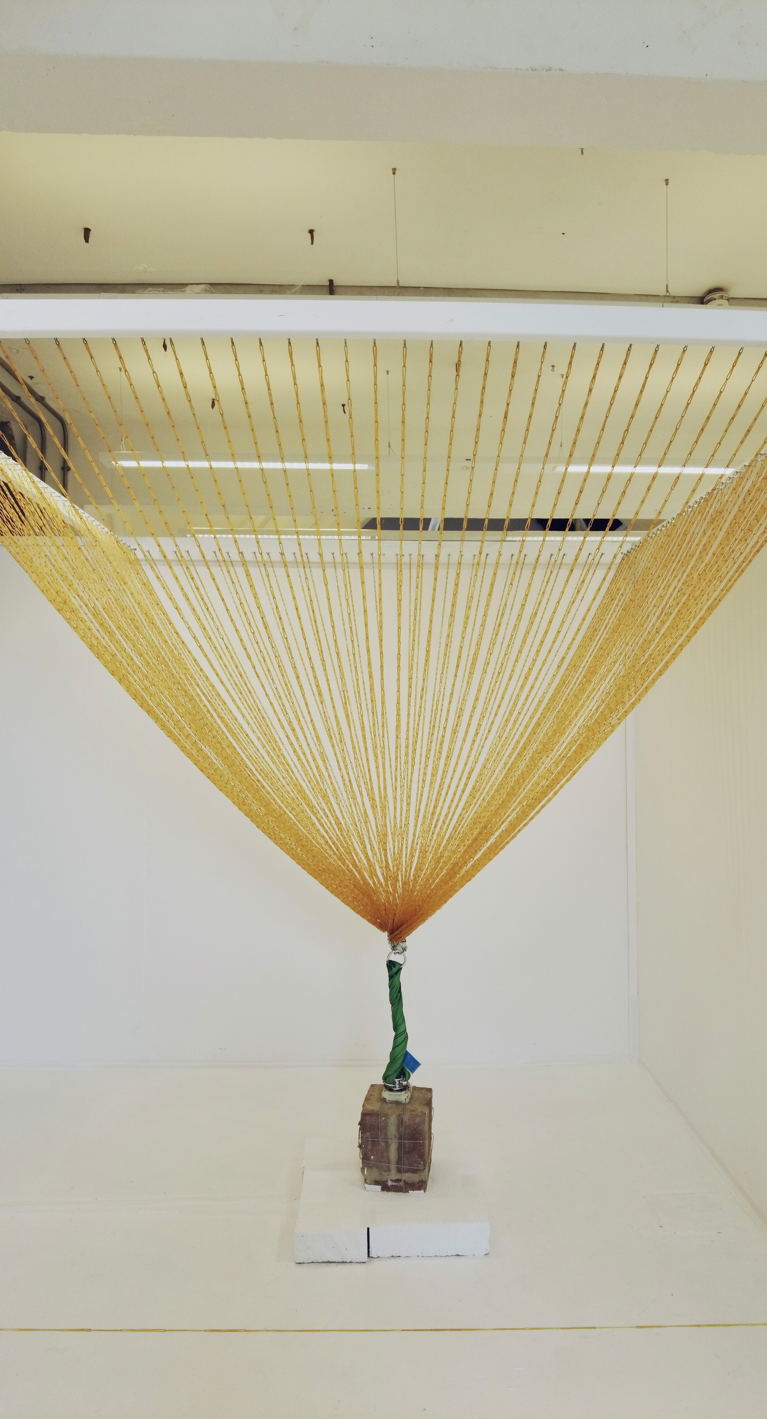 在这个作品中,超过六千条橡皮筋相互交织,形成一个锥形结构。在这橡皮筋结构下方,超过 25 公斤的重物被链条悬挂。