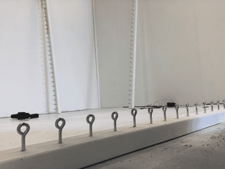 展览期间,嵌入混凝土中的电机不断收紧橡皮筋。在这场橡皮筋的弹性、重物的重力以及电机的机械力之间持续进行的较量中,锥形橡皮筋结构逐渐积累势能。