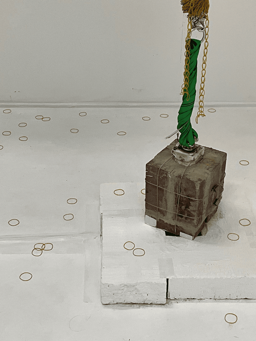 此外,橡皮筋在不断拉伸的过程中,其强度逐渐衰减,最终崩断、散落,牺牲。而砖块同时也在持续的提升、旋转、摩擦与撞击地面中逐渐磨损。在这件作品中,我们可以思考,在通往胜利的过程中,我们究竟经历了什么?我们承受了什么?哪些事物正在被削弱、被破碎,而哪些又最终得以成功?这种思考不仅仅关乎物理上的变化,更关乎在这场循环斗争中所经历的哲学与情感旅程。