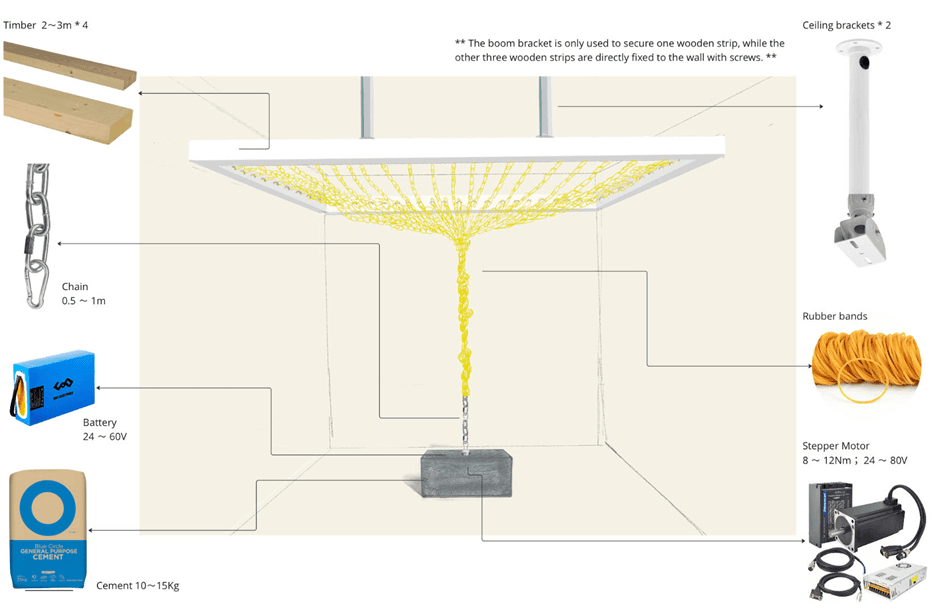 鉴于展览空间的半封闭特性,采用木质框架,并通过螺钉将其固定在两侧墙壁上,以防止橡皮筋的运动导致框架扭曲。此外,在框架的一角使用钢丝进行悬挂,以增强整体稳定性。