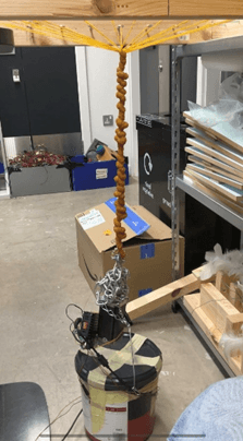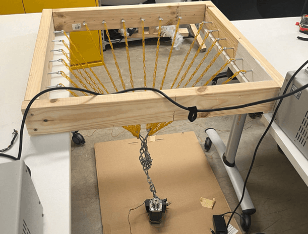 在实际测试中,我使用了一个 60 × 60 cm 的方形木框,并在其上悬挂了 28 条橡皮筋,由一个 3 Nm 的步进电机驱动。测试结果表明,在提升约 5 公斤的重物时,两条橡皮筋发生了断裂,步进电机也难以维持橡皮筋的扭转。此外,增加橡皮筋的数量能够降低单根橡皮筋所承受的力,从而减少断裂的风险。同时,橡皮筋与下方重物之间的高度也决定了橡皮筋的拉伸程度。具体来说,悬挂高度越高,橡皮筋的扭转次数越少,步进电机所承受的扭矩也相应减少,使得提升重物的过程更加顺畅。
