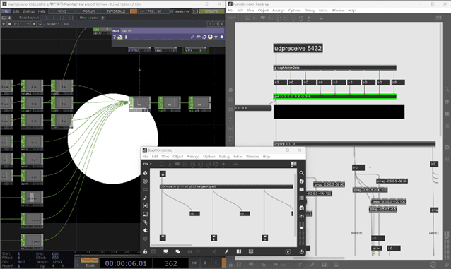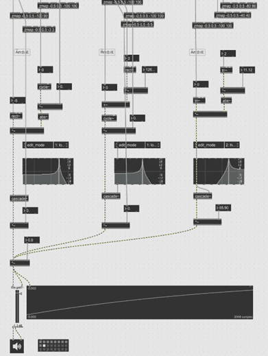 通过 TouchDesigner 与 Max/MSP 进行串行通信,将手部运动数据传输至 Max/MSP 进行声音处理。在 Max/MSP 中,提取手掌的X、Y、Z 轴数据,并与音频振荡器、滤波器等模块相连接,使手掌在不同方向的移动能够实时控制声音参数,创造动态的音频反馈。