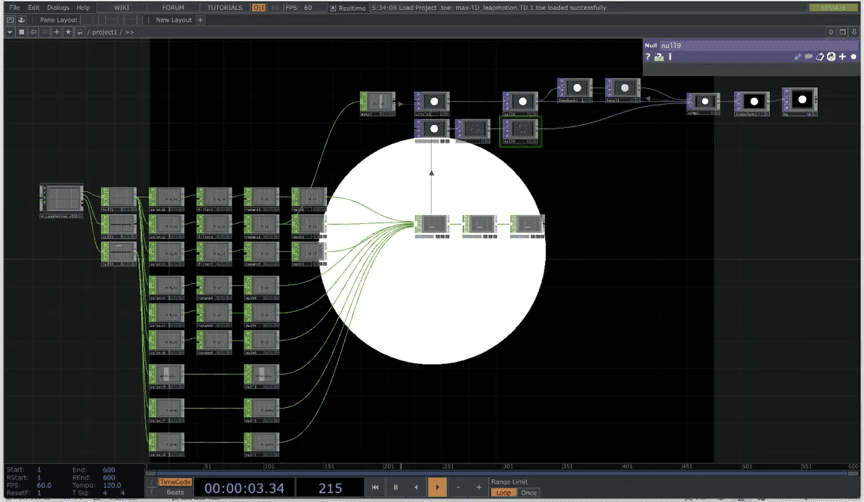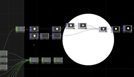 视觉部分的核心功能是提供直观的交互反馈。使用 TouchDesigner 采集 Leap Motion 传感器的数据,将手掌的空间坐标(X、Y、Z 轴)映射到屏幕上的实心圆,使其同步手掌的移动轨迹。此外,在屏幕中央放置一个同尺寸的静止空心圆,并在周围设有锚点。当实心圆与空心圆完美重叠时,即表示手掌位于屏幕中央,实现精准对位。