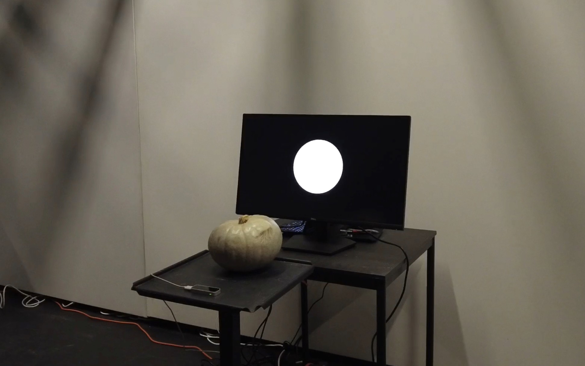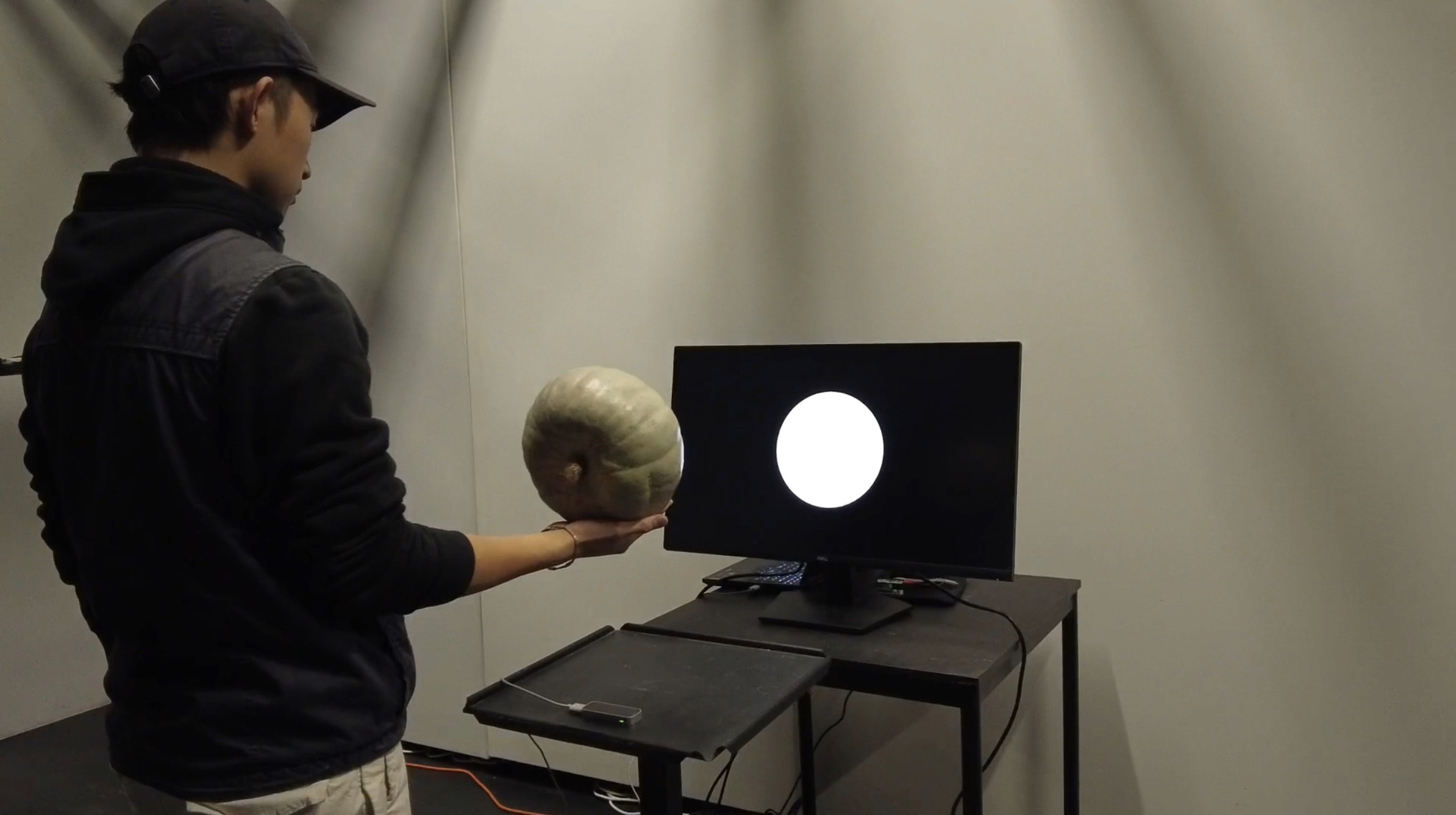 参与者需用手掌支撑一颗沉重的南瓜,感受南瓜的引体的同时,传感器将检测手掌的位置。观者需尝试将手掌与屏幕上的空心圆对齐。在这一过程中,展现的是人体耐力与意志、手臂肌肉力量与南瓜重力之间的角逐。南瓜持续向下施压,而人的手掌则不断向上抵抗。然而,随着时间推移,手掌支撑的力量逐渐衰退,南瓜缓慢下沉,最终引发手部的颤抖和不可避免的失衡。
