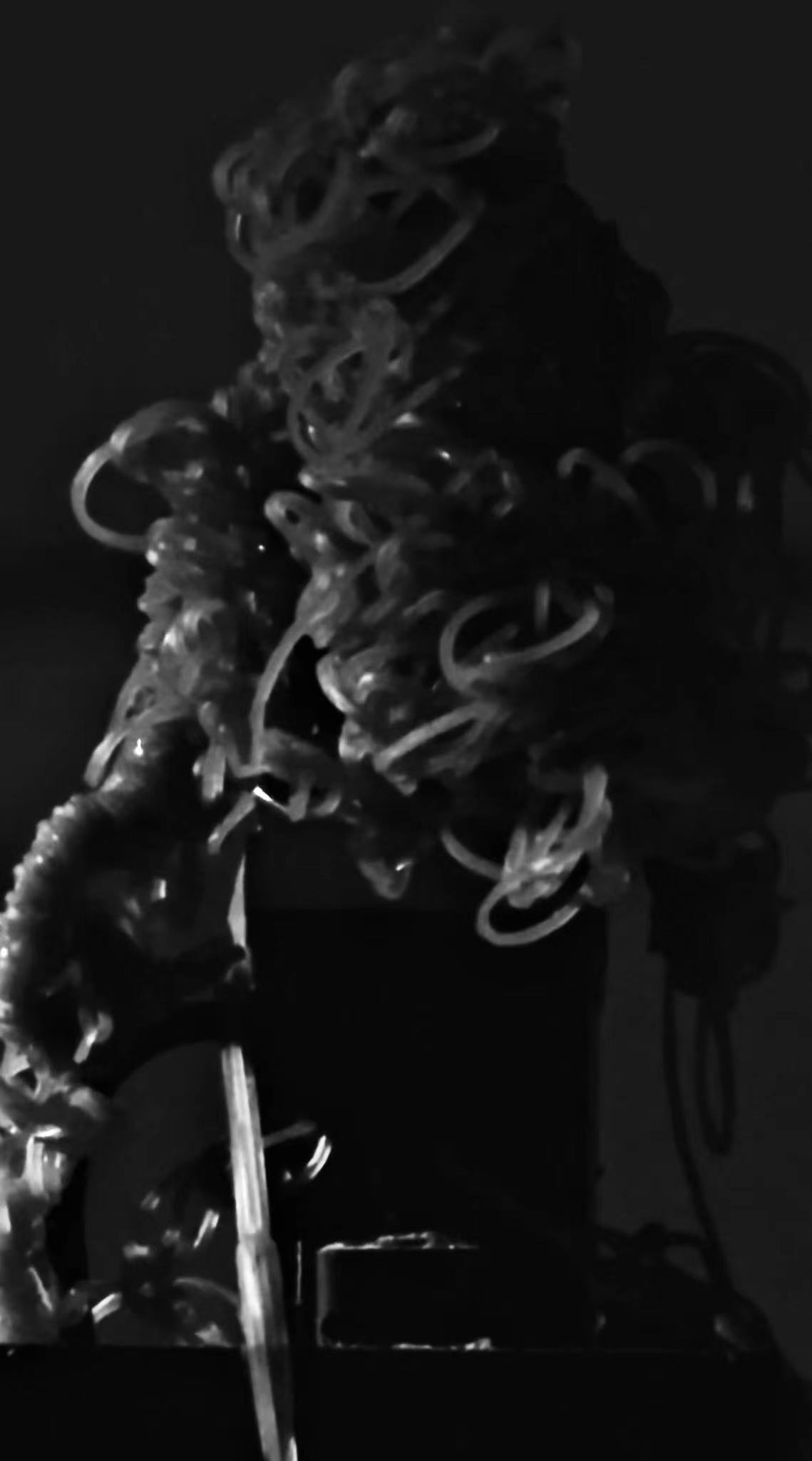 上方的电机象征持久而恒定的控制,其协议代码成为一切能量与运动的源头:橡皮筋的拉扯、挤压与变形都追溯至这个微小的起点。在此过程中,生命活动被映射为重复与耗散的姿态。